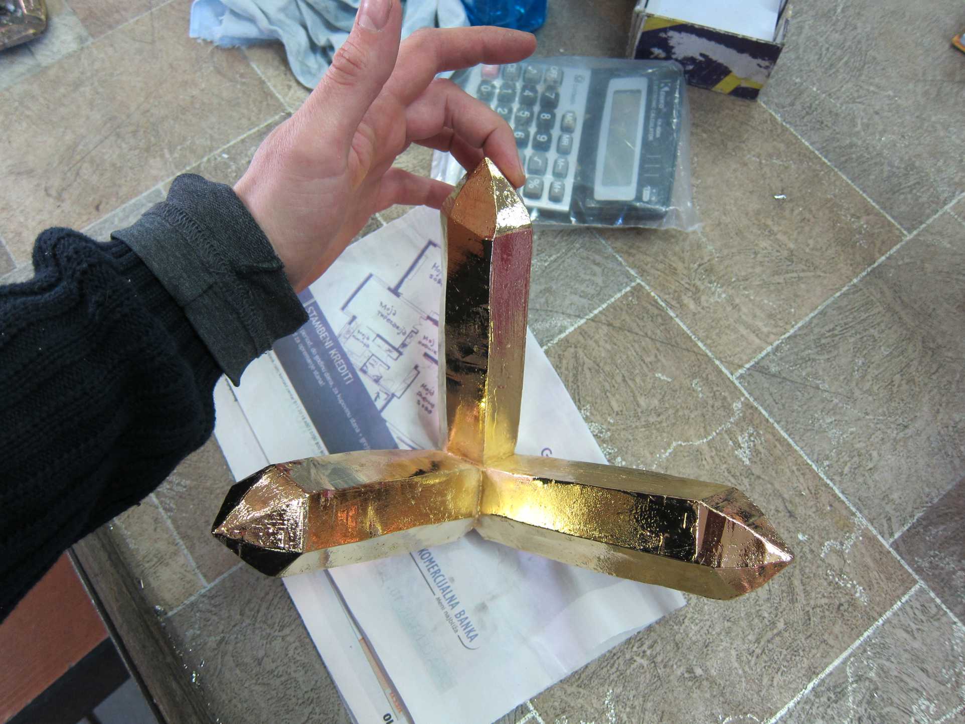 Beatrice Lozza asked to cast wax-sculpted crystal in a heavy material but to have a gold finish. A solid lead cast was made and plated with 24K gold.