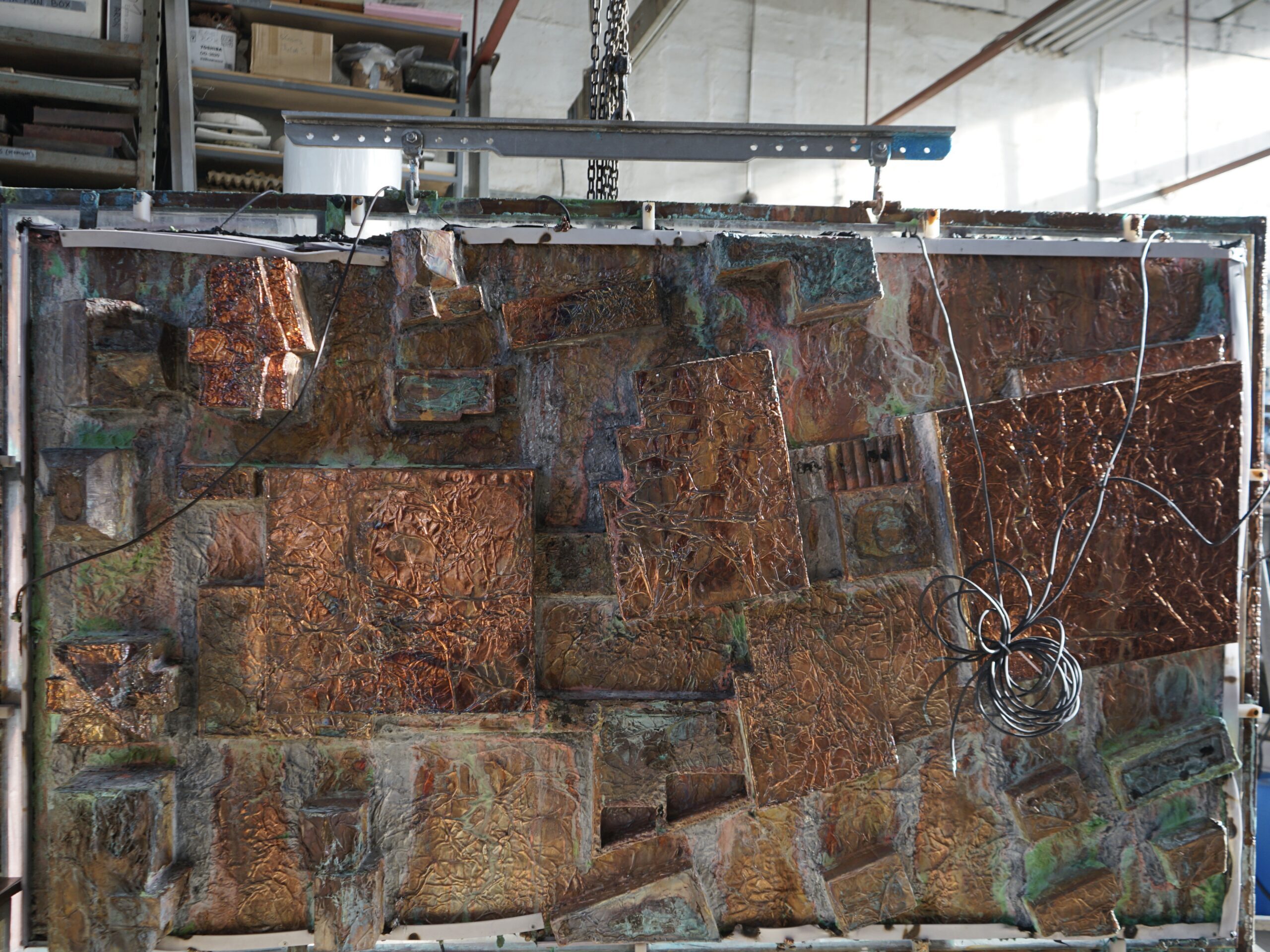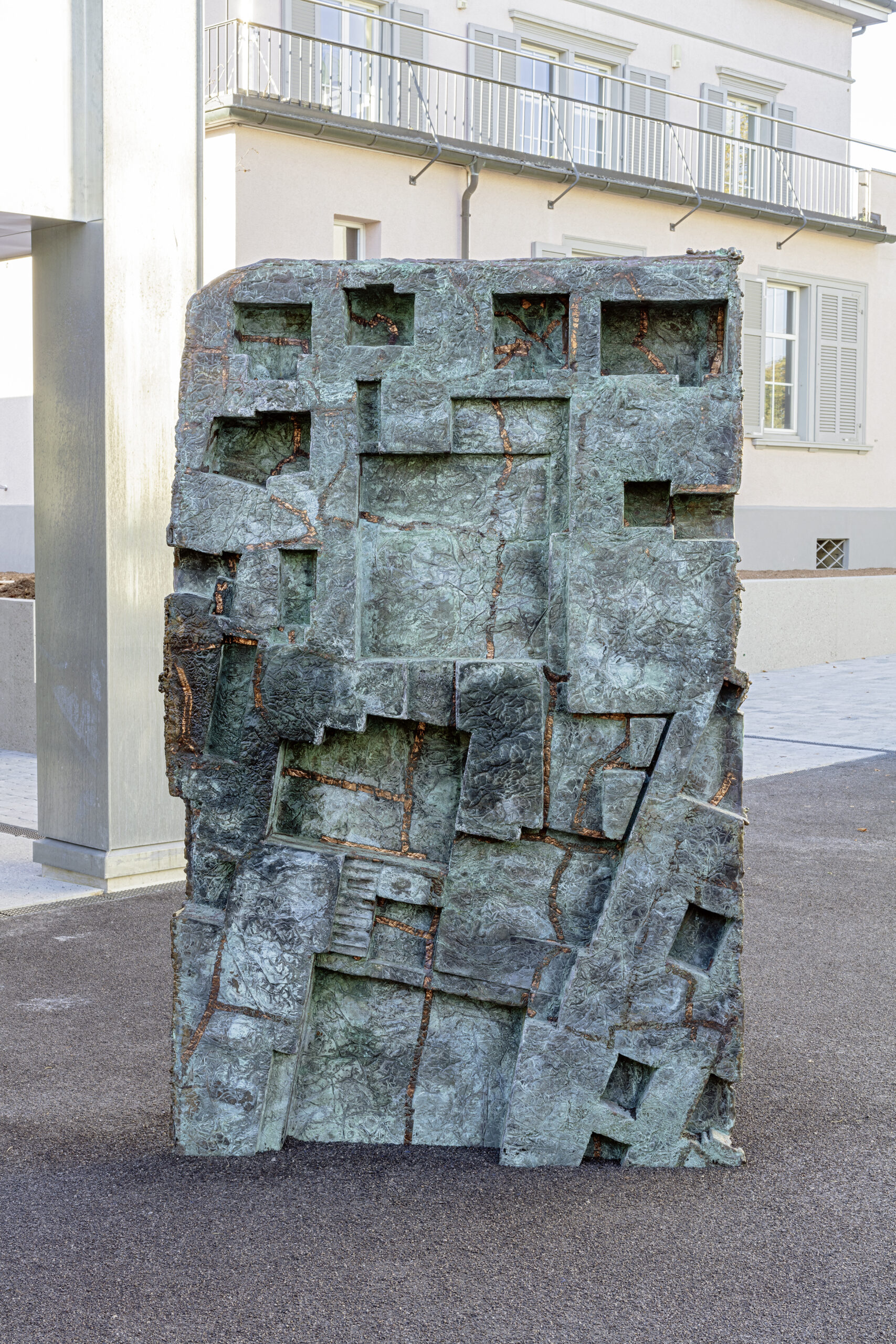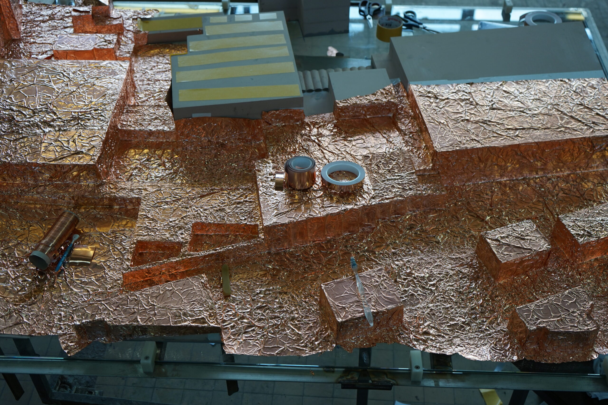 This foil-skin, bearing the imprint of buildings and terrain, was electroplated via galvanic bath into a rigid copper plate about 5 mm thick kunstbulletin.ch.