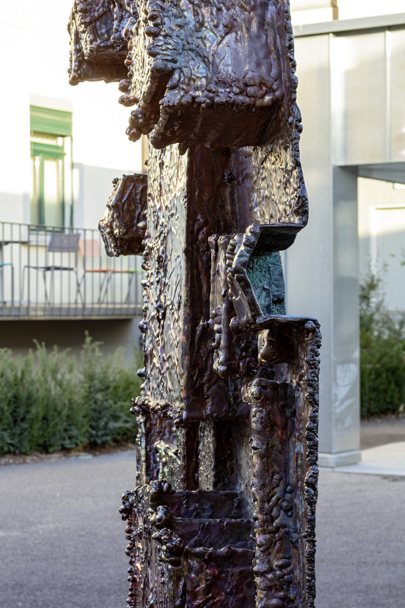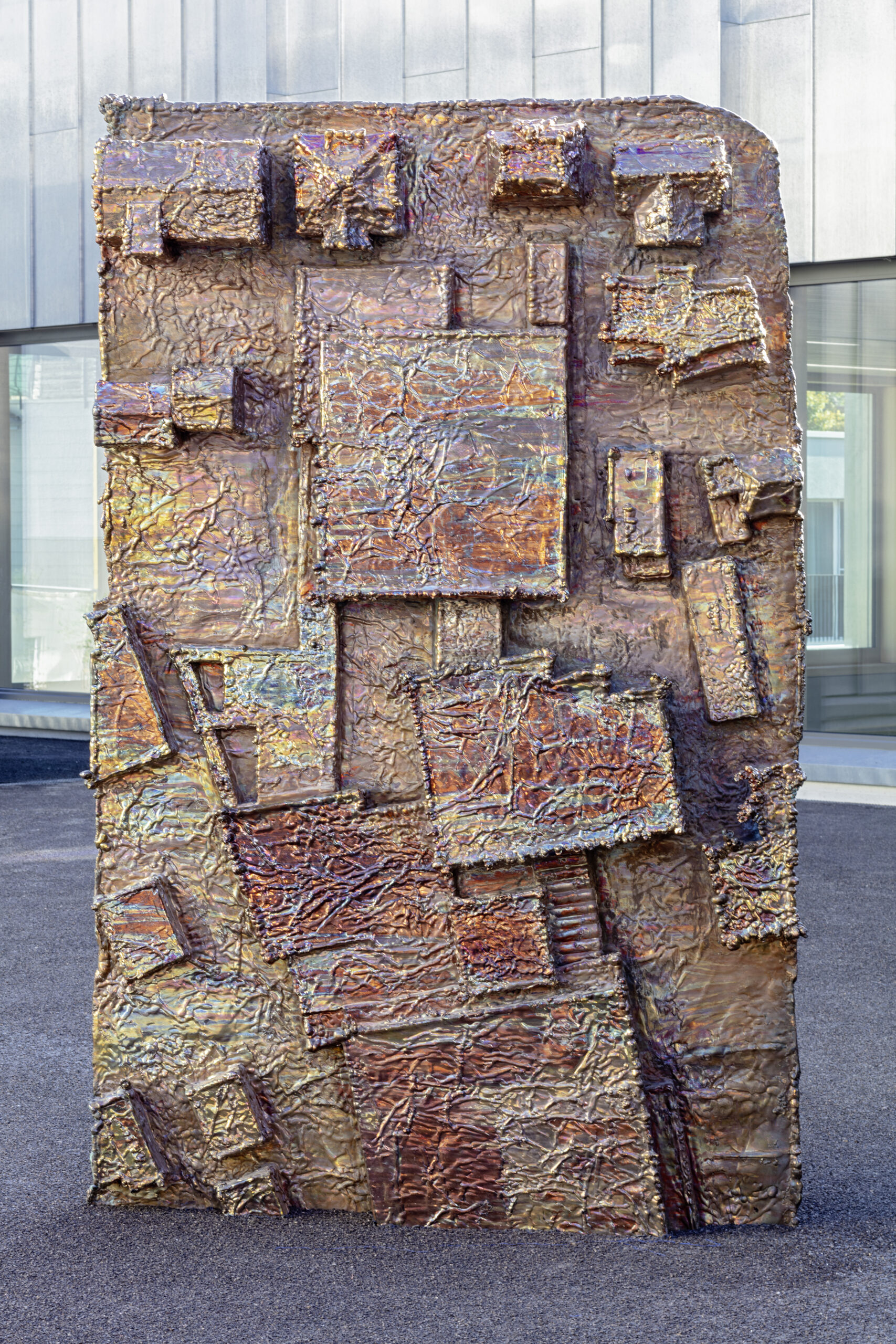 The final sculpture stands vertically at 216 × 134 × 20 cm, with a striking dual-tone patina—copper-red blending into turquoise-blue from oxidation kunstbulletin.ch.