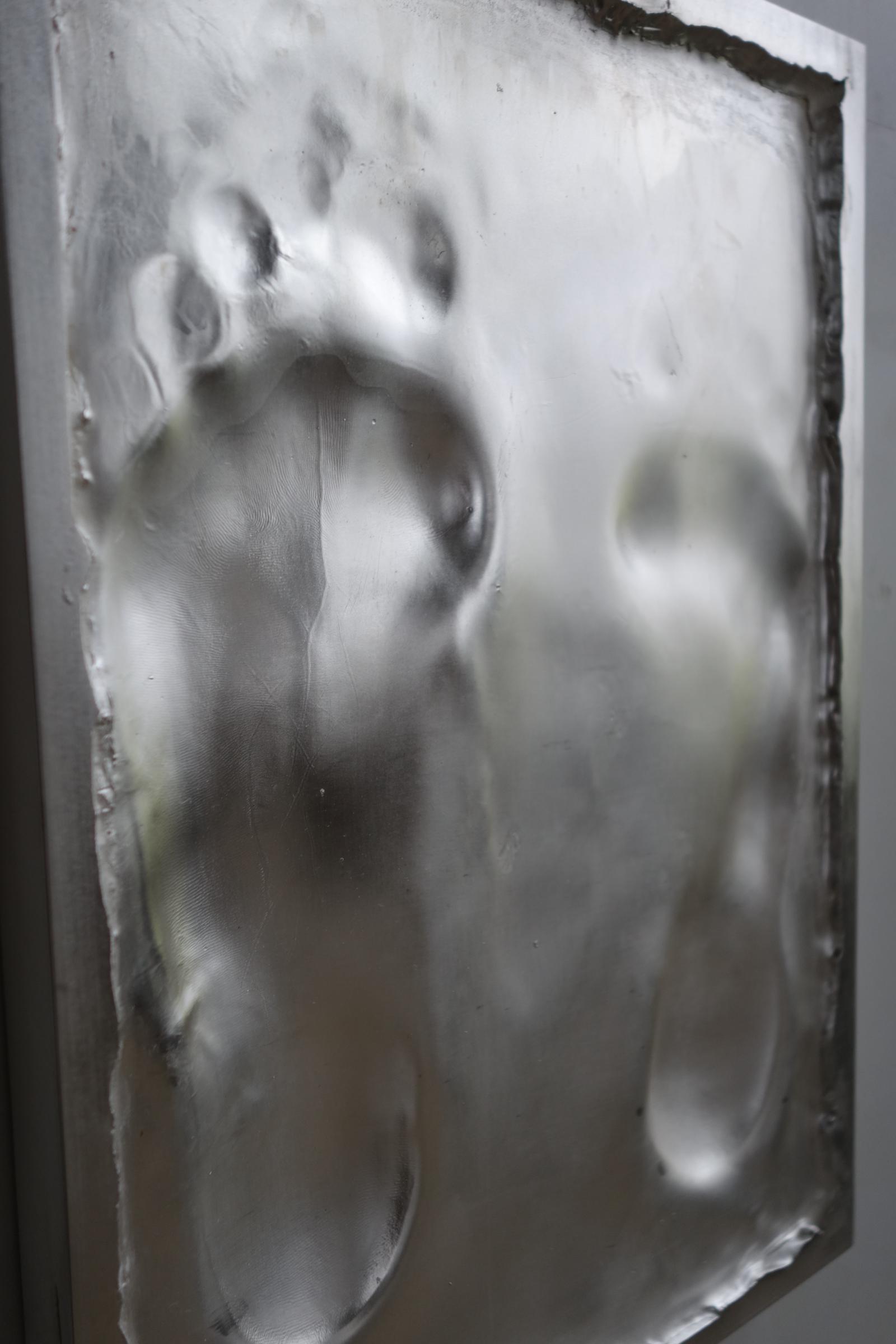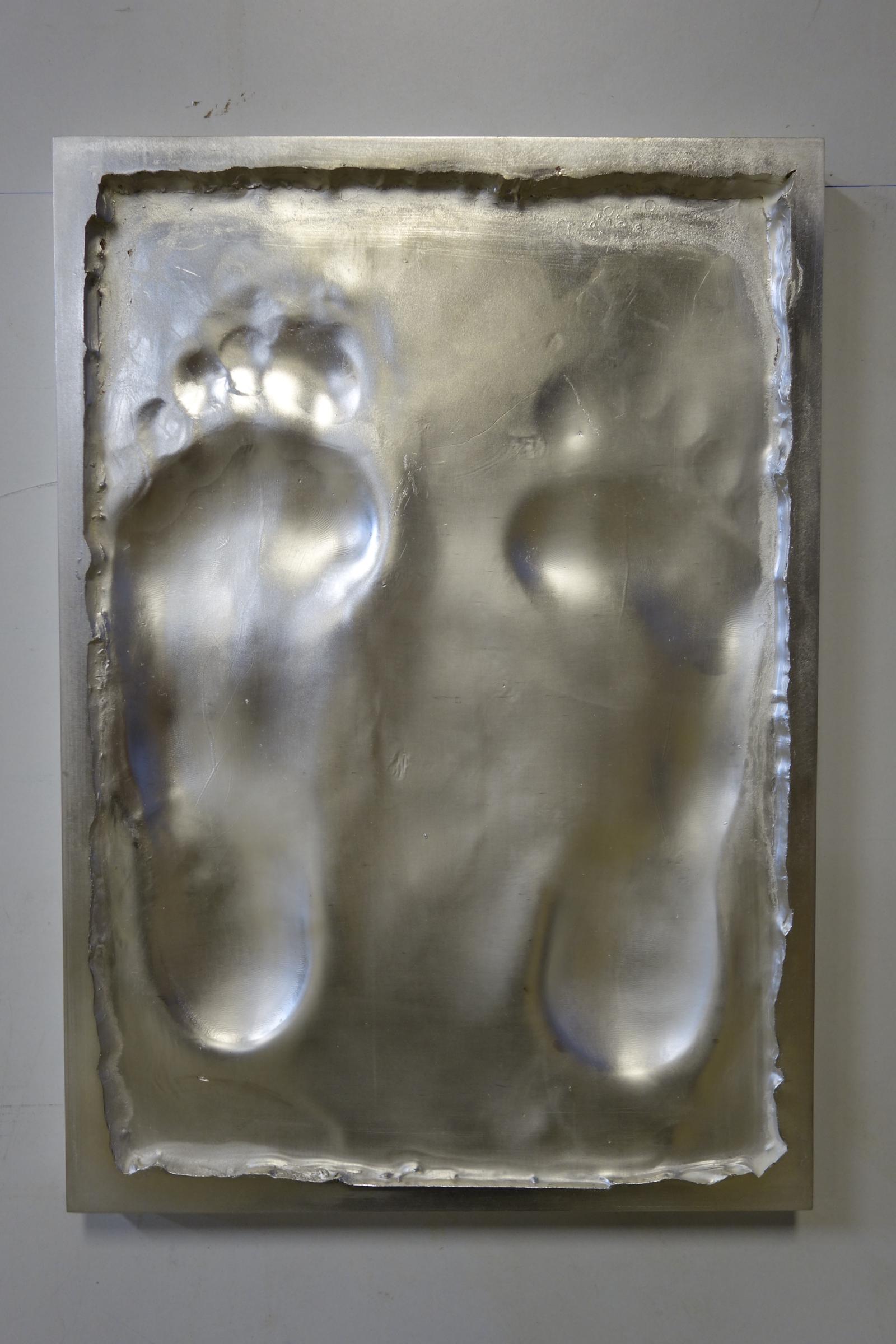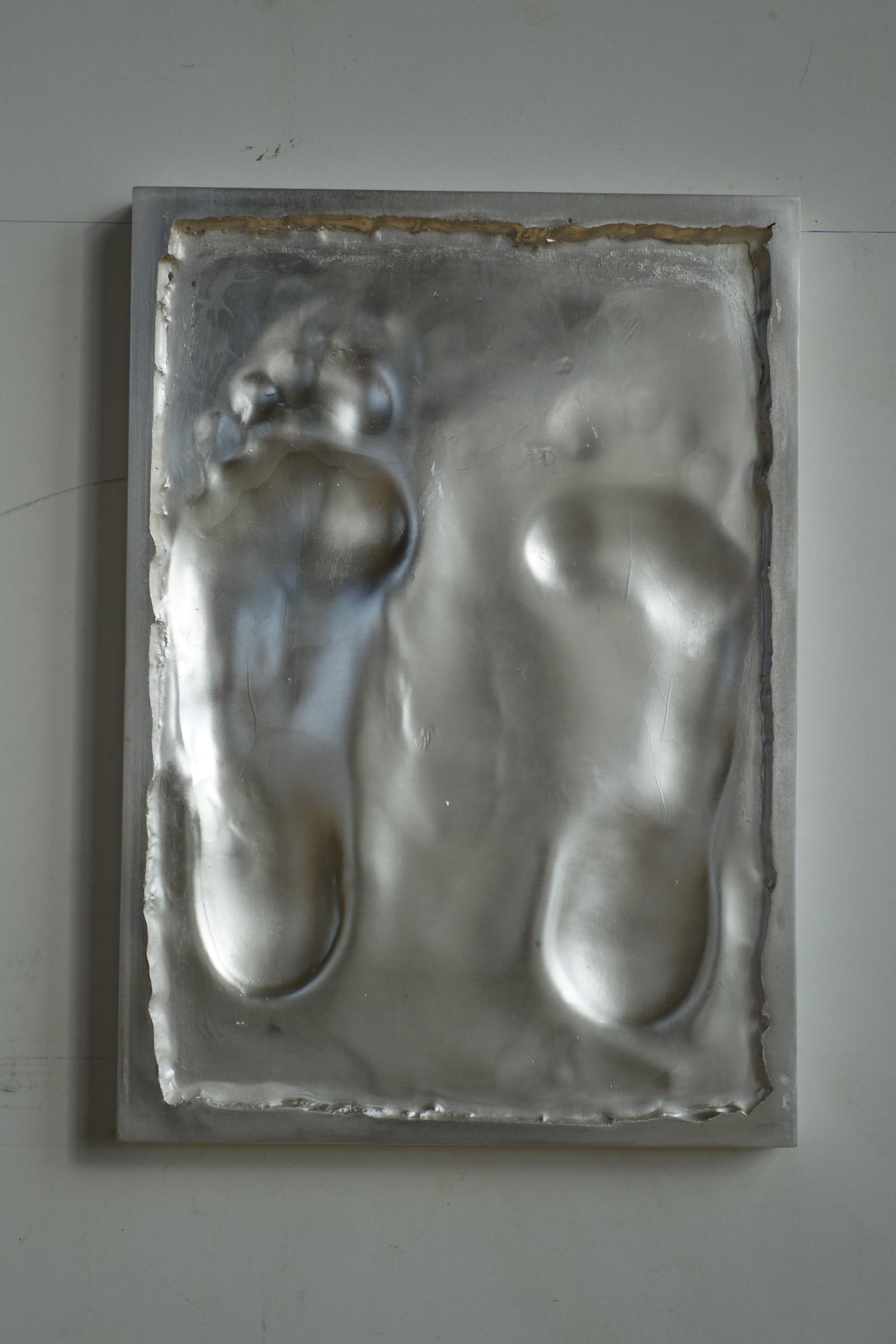 Marta Jovanović left the imprint of her person with standing on a wax surface. The fine dermatoglyphic signs of the feet (skin structer/finger print) where transferred to the wax surface. This surface was formed in copper and silver plated.