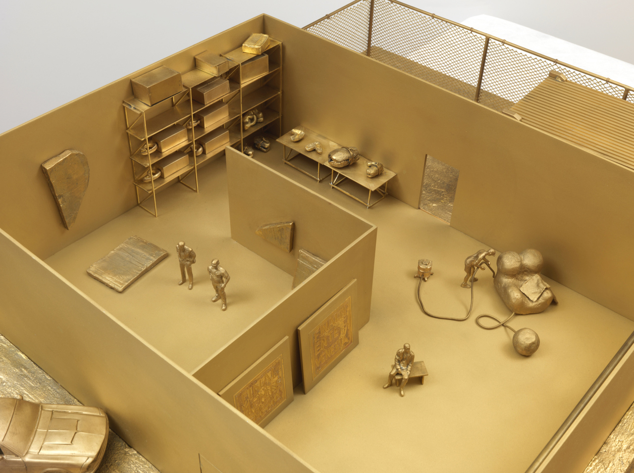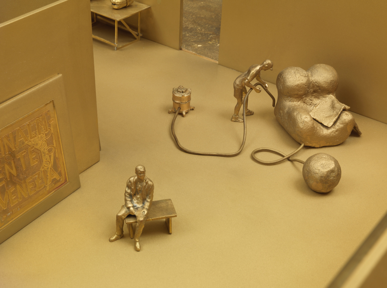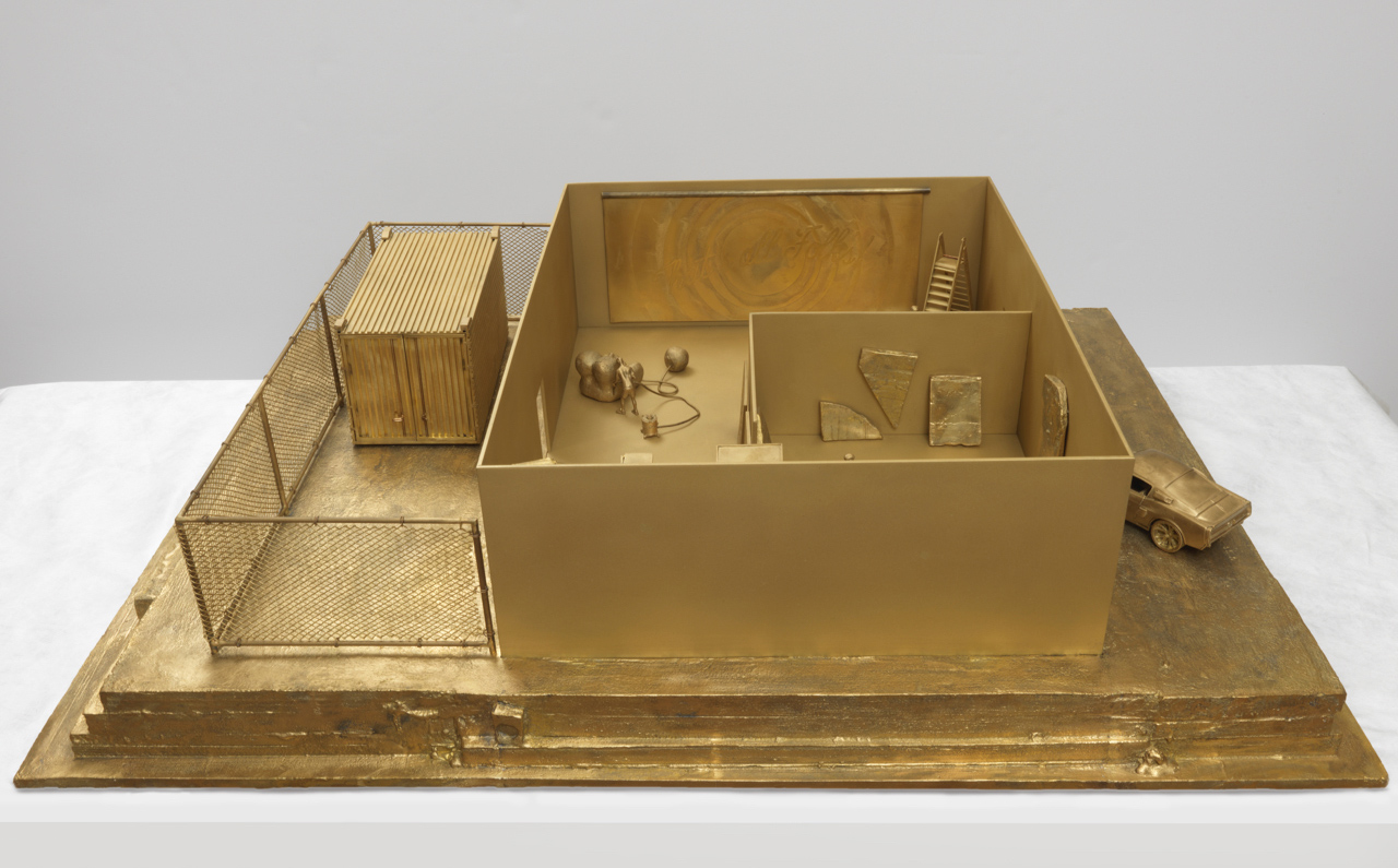 Piero Golia‘s fictional artist studio with sculptures, materials, tools, machines, cars, assistants, visitors, friends, collectors and media people.