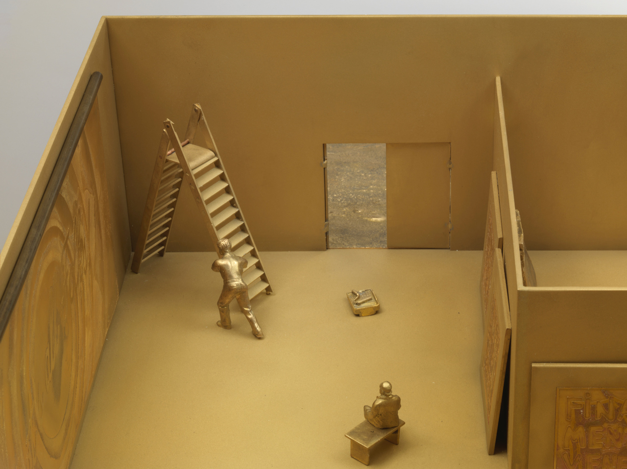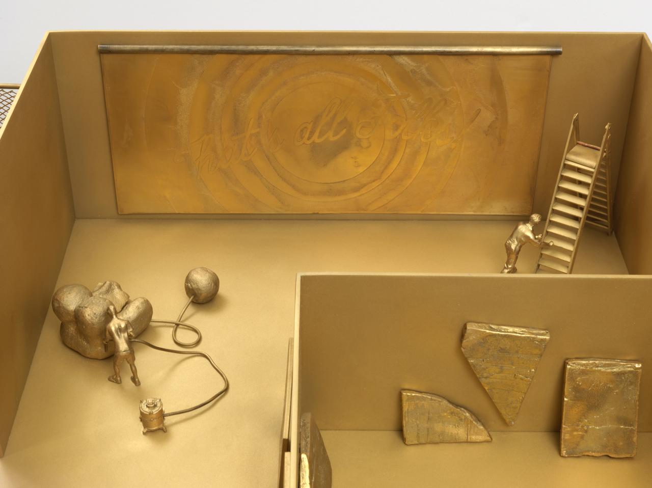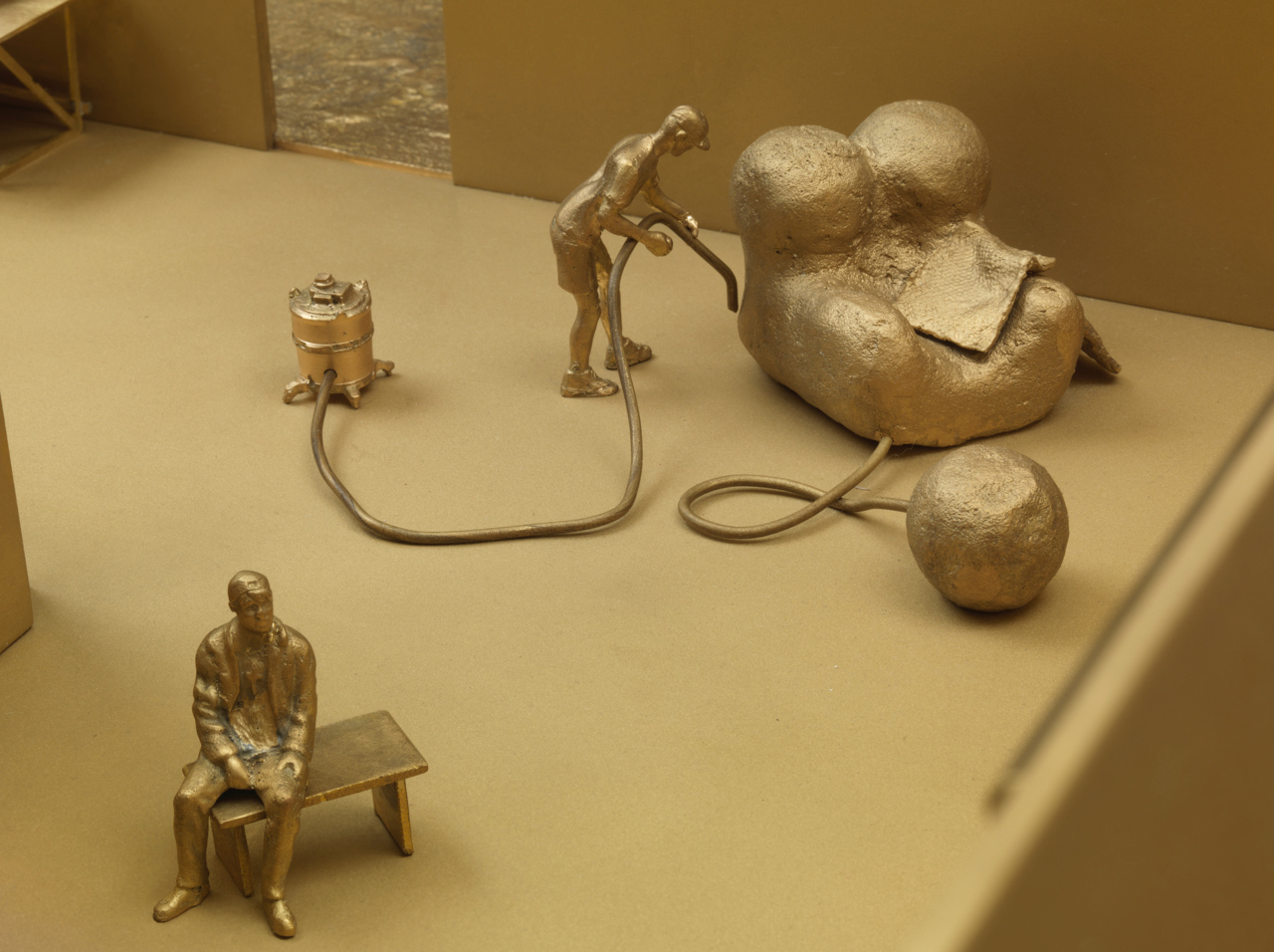 Piero Golia‘s fictional artist studio with sculptures, materials, tools, machines, cars, assistants, visitors, friends, collectors and media people.